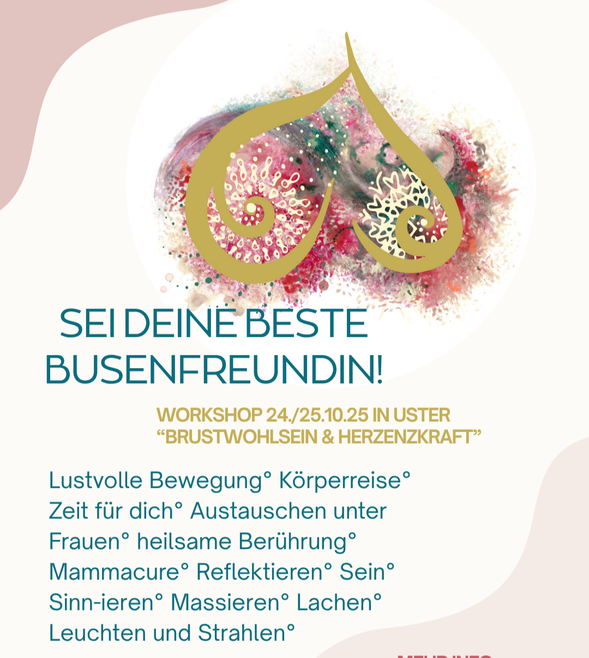 Und genau hier kommt die gute Botschaft: Der Workshop "Busenfreundin" verbindet dein Brustwohlsein mit deiner Herzenskraft, und möchte dir einen neuen Zugang zu deinen Brüsten eröffnen. Er soll von Vertrautheit, Selbstliebe, Softness, Achtsamkeit und Verbundenheit mit dir selbst getragen sein.